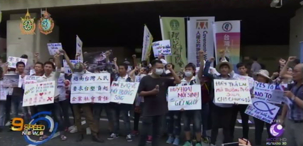 ไต้หวัน 10 ส.ค.-นักเคลื่อนไหวชาวเวียดนามชุมนุมประท้วงหน้าสำนักงานบริษัทเจ้าของโรงงานเหล็กไต้หวันในกรุงไทเป หลังปล่อยสารพิษสู่ชายฝั่งเวียดนาม ทำให้ปลาตายจำนวนมาก และกระทบผู้คนกว่า 200,000 คน