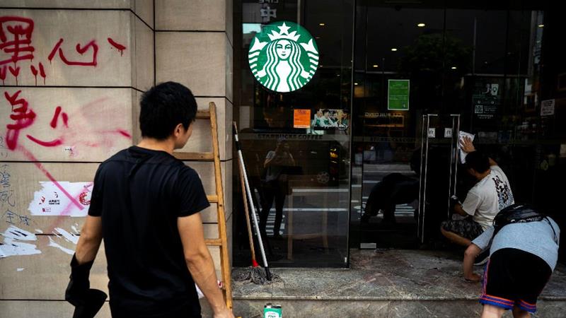 ผู้ประท้วงพ่นคำชวนคว่ำบาตร คำด่าทอตำรวจและแม็กซิมส์ เคเทอเรอร์ เครือร้านอาหารใหญ่ของฮ่องกงบนกำแพงร้านสตาร์บัคส์สาขาหนึ่งในย่านหว่านไจ๋ช่วงสุดสัปดาห์ที่ผ่านมา หลังจากนางแอนนี หวู บุตรสาวผู้ก่อตั้งแมกซิมส์ เคเทอเรอร์ กล่าวสุนทรพจน์ต่อคณะมนตรีสิทธิมนุษยชนแห่งสหประชาชาติเมื่อต้นเดือนประณามผู้ประท้วงในฮ่องกง และชักชวนผู้คนสนับสนุนให้รัฐบาลจีนใช้ท่าทีแข็งกร้าวกับผู้ประท้วง ทำให้หลายคนรวมทั้งนายโจชัว หว่อง นักเรียกร้องประชาธิปไตยวัย 22 ปี เรียกร้องให้คว่ำบาตรร้านสตาร์บัคส์เพราะแมกซิมส์ เคเทอเรอร์ได้สิทธิบริหารในฮ่องกง และมีคนกว่า 50,000 คน ลงชื่อเรียกร้องให้สตาร์บัคส์ในสหรัฐตัดความสัมพันธ์ทางธุกิจกับบริษัทนี้