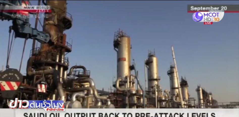 เจ้าชายอับดุลอาซิซ บิน ซัลมาน รัฐมนตรีพลังงานซาอุดีอาระเบีย เผยกำลังการผลิตน้ำมันของประเทศเกือบกลับเข้าสู่ภาวะปกติ หลังถูกโจมตีโรงกลั่นน้ำมัน 2 แห่ง เมื่อเดือนที่ผ่านมา โดยกำลังผลิตน้ำมันของประเทศตอนนี้ เริ่มมีเสถียรภาพอยู่ที่ 11.3 ล้านบาร์เรล/วัน ขณะที่ราคาน้ำมันดิบในตลาดโลกก็ปรับตัวลดลงเช่นกัน