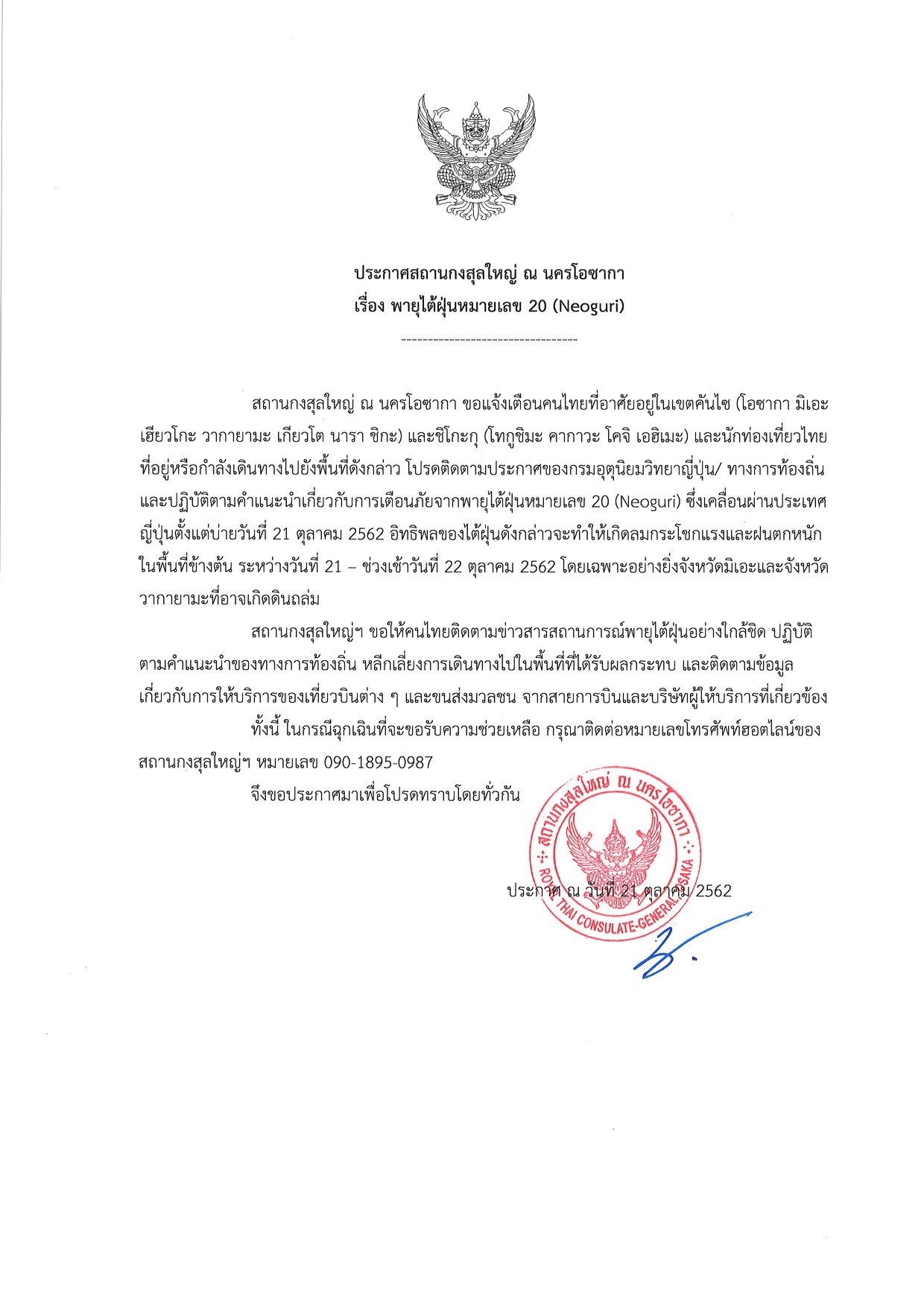 สถานกงสุลใหญ่ ณ นครโอซากา ขอแจ้งเตือนคนไทยที่อาศัยอยู่ในเขตคันไซ (โอซากา มิเอะเฮียวโกะ วากายามะ เกียวโต นารา ชิกะ) และชิโกะกุ (โทกูชิมะ คากาวะ โคจิ เอฮิเมะ) และนักท่องเที่ยวไทยที่อยู่หรือกำลังเดินทางไปยังพื้นที่ดังกล่าว โปรดติดตามประกาศของกรมอุตุนิยมวิทยาญี่ปุ่น ทางการท้องถิ่น และปฏิบัติตามคำแนะนำเกี่ยวกับการเตือนภัยจากพายุไต้ฝุ่นหมายเลข 20 (Neoguri) ซึ่งเคลื่อนผ่านประเทศญี่ปุ่นตั้งแต่บ่ายวันที่ 21 ตุลาคม 2562 อิทธิพลของไต้ฝุ่นดังกล่าวจะทำให้เกิดลมกระโชกแรงและฝนตกหนักในพื้นที่ข้างต้น ระหว่างวันที่ 21- ช่วงเช้าวันที่ 22 ตุลาคม 2562 โดยเฉพาะอย่างยิ่งจังหวัดมิเอะและจังหวัดวากายามะที่อาจเกิดดินถล่ม