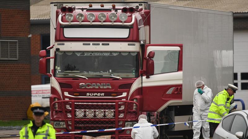เจ้าหน้าที่อังกฤษกำลังสอบปากคำนายโม โรบินสัน คนขับรถบรรทุกซึ่งเป็นชาวไอร์แลนด์เหนือวัย 25 ปี ฐานต้องสงสัยฆาตกรรม นอกจากนี้ยังจับกุมผู้ต้องสงสัยอีก 2 คนในข้อหาฆ่าคนตาย และจับกุมชายหนึ่งหญิงหนึ่งวัย 38 ปีเท่ากัน ฐานต้องสงสัยฆ่าคนตายและคบคิดกันค้ามนุษย์ ข้อมูลจีพีเอสระบุว่า รถบรรทุกที่มีคอนเทนเนอร์แช่เย็นนี้ข้ามไปมาระหว่างอังกฤษกับยุโรปอยู่หลายวัน ก่อนมีคนพบรถจอดทิ้งไว้ที่นิคมอุตสาหกรรมในเทศมณฑลเอสเซกซ์เมื่อเช้าวันที่ 23 ตุลาคม ตำรวจเอสเซกซ์เผยว่า รถขับมาจากกรุงดับลินของไอร์แลนด์เข้าอังกฤษผ่านทางท่าเรือแคว้นเวลส์เมื่อวันที่ 20 ตุลาคม.-สำนักข่าวไทย