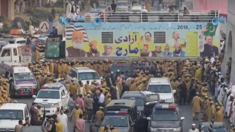 การประท้วงวันนี้นำโดยนายฟาซาล อูร์ เรห์มาน ประธานพรรคจาเมียต อูเลมา อี อิสลาม (เอฟ) หนึ่งในพรรคเคร่งศาสนาใหญ่ที่สุดของปากีสถานที่กล่าวหารัฐบาลนายข่าน อดีตนักคริกเกตชื่อดังว่าไร้ประสิทธิภาพและไร้ความชอบธรรม เพราะตั้งขึ้นโดยกองทัพหลังจากโกงการเลือกตั้ง นายเรห์มานประกาศกับผู้สื่อข่าวว่า จะไม่หยุดการเคลื่อนไหวจนกว่าจะได้ในสิ่งที่ต้องการเมื่อเคลื่อนขบวนถึงกรุงอิสลามาบัด นั่นคือให้นายกรัฐมนตรีลาออก และยุบสภานิติบัญญัติที่จอมปลอมทั้งสภา ด้านพรรคฝ่ายค้านอีกสองพรรคประกาศสนับสนุนการโค่นนายกรัฐมนตรี แต่ไม่สนับสนุนการกระทำใด ๆ ที่ขัดต่อรัฐธรรมนูญ