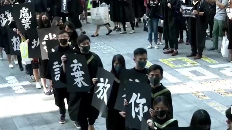 ฮ่องกง 7 พ.ย. – นักศึกษามหาวิทยาลัยฮ่องกงราว 1,000 คนในชุดครุยเข้าร่วมงานรับปริญญา โดยพากันสวมหน้ากากสีดำ ท้าทายคำสั่งของรัฐบาลที่ห้ามสวมหน้ากาก และบางส่วนก็ถือป้ายข้อความ “ปลดปล่อยฮ่องกง ปฏิวัติเสียแต่บัดนี้” ขณะที่บางส่วนก็ร้องตะโกนถ้อยคำให้รัฐบาลปฏิบัติตามข้อเรียกร้องของผู้ประท้วง ขณะเคลื่อนขบวนจากสถานีรถไฟฟ้าไปยังสถานที่จัดงาน