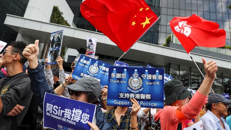 ผู้สนับสนุนโบกธงชาติจีนและฮ่องกงที่หน้าสภานิติบัญญัติและสำนักงานใหญ่ตำรวจ บางคนถือป้ายและตะโกนว่าขอเคียงข้างและให้กำลังใจตำรวจ การชุมนุมวันนี้มีทั้งคนหนุ่มสาว คนชรา บางคนนำเด็กเล็กมาด้วย แม่บ้านวัย 49 ปีกล่าวว่า ขอพูดจากใจจริงว่ พวกเธอเชื่อว่าเป็นเรื่องถูกต้องแล้วที่จะสนับสนุนตำรวจปราบปรามผู้ก่อจลาจลเพื่อชาวฮ่องกง คนจำนวนมากนิ่งเงียบเพราะกลัวผู้ก่อจลาจล แต่ตอนนี้ถึงเวลาที่คนนิ่งเงียบจะลุกขึ้นบอกว่าพอได้แล้ว ชายวัย 34 ปีบอกว่า ผู้ประท้วงน่ารังเกียจเหมือนแมลงสาบ เขาเข้าร่วมการประท้วงร่มปี 2557 ที่เป็นการเคลื่อนไหวอย่างสันติเพื่อปลุกจิตสำนึก แต่การประท้วงขณะนี้กลายเป็นว่าคนไม่เห็นด้วยคือคนที่เป็นศัตรูและจะต้องถูกขว้างระเบิดเพลิง
