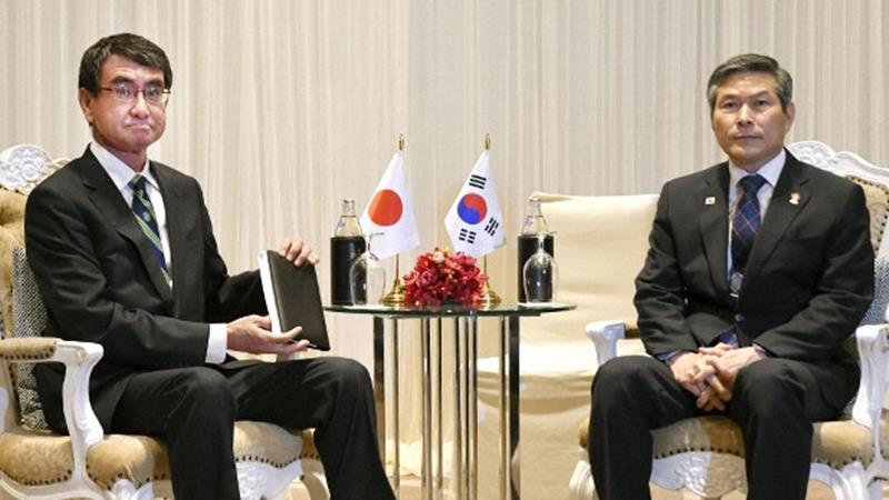 ก่อนหน้านี้ เกาหลีใต้ ซึ่งกำลังมีข้อพิพาทกับญี่ปุ่น ทั้งเรื่องการค้าและเรื่องการบังคับใช้แรงงานทาสสมัยสงครามโลก ได้ตัดสินใจที่จะไม่ต่ออายุข้อตกลงความมั่นคงทั่วไปว่าด้วยข้อมูลทหาร ซึ่งเป็นข้อตกลงแบ่งปันข้อมูลข่าวกรองระหว่างกัน ที่กำลังจะหมดอายุในวันที่ 23 พฤศจิกายน และในการพบกันระหว่าง นายจอง คยอง ดู รัฐมนตรีกลาโหมเกาหลีใต้และนายทาโร โคโนะ รัฐมนตรีกระทรวงการป้องกันประเทศของญี่ปุ่นที่กรุงเทพฯเมื่อวันอาทิตย์ เกาหลีใต้โทษว่าการที่ญี่ปุ่นเพิ่มความเข้มงวดในการควบคุมการส่งออกสินค้าให้เกาหลีใต้ คือเหตุผลที่ทำให้เกาหลีใต้ตัดสินใจไม่ต่ออายุข้อตกลงดังกล่าวออกไป พร้อมเร่งเร้าให้ญี่ปุ่นเปลี่ยนท่าที ขณะที่ญี่ปุ่นได้เรียกร้องให้เกาหลีใต้ใช้วิธีอื่นที่ฉลาดกว่า ในการตอบโต้ญี่ปุ่น