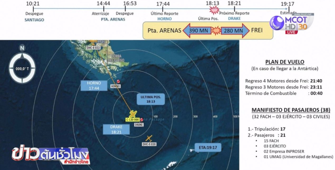 ชิลี 10 ธ.ค. – เครื่องบินขนส่งเฮอร์คิวลีส ซี-130 ของกองทัพอากาศชิลี พร้อมผู้โดยสาร 21 คน และลูกเรือ 17 คน ออกเดินทางจากเมืองปุนตา อาเรนาส์ ทางใต้ของชิลี ไปส่งกำลังบำรุงยังฐานทัพที่ขั้วโลกใต้ เมื่อเวลา 16.55 น. ตามเวลาท้องถิ่น ขาดการติดต่อกับหอควบคุมการบินในเวลา 18.00 น. ขณะนี้กองทัพอากาศได้ส่งหน่วยกู้ภัยออกค้นหาและช่วยเหลือแล้ว