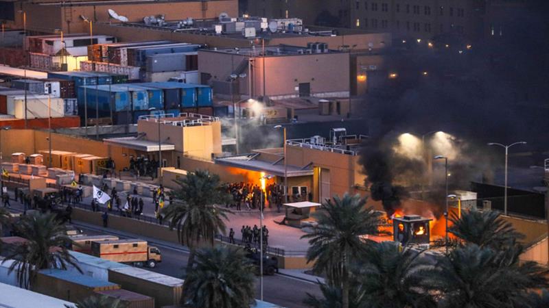 ก่อนหน้านี้ในวันเดียวกัน ผู้ประท้วงจำนวนมากพยายามบุกเข้าไปในสถานทูตสหรัฐในกรุงแบกแดดซึ่งอยู่ในเขตกรีนโซนหรือเขตที่มีมาตรการคุ้มกันแน่นหนา เผาสิ่งของหน้าสถานทูตและขว้างปาก้อนหินข้ามกำแพง แต่ไม่สามารถบุกเข้าไปได้และถูกเจ้าหน้าที่รักษาความปลอดภัยยิงแก๊สน้ำตาตอบโต้ ผู้ประท้วงเหล่านี้ไม่พอใจที่สหรัฐใช้ปฏิบัติการโจมตีทางอากาศในอิรักและซีเรียเมื่อวันอาทิตย์ มีผู้เสียชีวิต 25 คน บาดเจ็บ 51 คน หลังจากกลุ่มติดอาวุธชีอะห์ทำให้ทหารอเมริกันบาดเจ็บจำนวนมากและทำให้ผู้รับเหมาชาวอเมริกันเสียชีวิตหนึ่งคน ประธานาธิบดีโดนัลด์ ทรัมป์ทวีตเมื่อวันอังคารกล่าวโทษอิหร่านว่า สังหารผู้รับเหมาชาวอเมริกัน ทำให้ทหารบาดเจ็บจำนวนมาก และตอนนี้หันมาบงการให้คนบุกสถานทูตสหรัฐในอิรัก อิหร่านจะต้องรับผิดชอบกับการกระทำดังกล่าว ส่วนอิรักในฐานะประเทศเจ้าบ้าน สหรัฐหวังว่าจะให้การอารักขาสถานทูตสหรัฐด้วย.-สำนักข่าวไทย