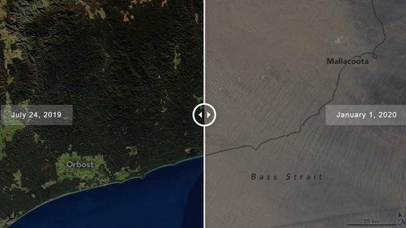 นาซาเผยแพร่ภาพถ่ายจากดาวเทียมแลนแซต8 ที่ทำหน้าที่ถ่ายภาพพื้นผิวโลกทั้งใบอย่างต่อเนื่อง เลือกเปรียบเทียบเฉพาะภาพถ่ายเหนือพื้นที่ระหว่างเมืองออร์บอสต์ไปจนถึงเมืองมัลลาคูตาเป็นระยะทาง 144 กิโลเมตรตามแนวชายฝั่งรัฐวิกตอเรีย ทางตะวันออกเฉียงใต้ของออสเตรเลีย ภาพแรกถ่ายเมื่อวันที่ 24 กรกฎาคมปีก่อน เห็นแต่พื้นที่เขียวอชุ่มปกคลุมไปทั่ว ภาพที่สองถ่ายเมื่อวันที่ 1 มกราคมที่ผ่านมา เห็นแต่ควันหนาทึบสีเทา มองไม่เห็นพื้นเบื้องล่าง นาซาเผยแพร่ภาพเหล่านี้เมื่อวันศุกร์ก่อนที่ทางการออสเตรเลียประกาศสถานการณ์ฉุกเฉินและบังคับอพยพคนในรัฐนิวเซาท์เวลส์ ส่วนเขตให้นักท่องเที่ยวออกจากพื้นที่ได้ขยายไปจนชายแดนรัฐนิวเซาท์เวลส์ที่ติดกับรัฐวิกตอเรีย ด้านสำนักงานบริหารมหาสมุทรและชั้นบรรยากาศแห่งชาติสหรัฐเผยแพร่ภาพถ่ายสูงจากผิวโลกร่วม 36,800 กิโลเมตร เห็นกลุ่มควันสีน้ำตาลเทาขนาดใหญ่จากไฟป่าออสเตรเลียกระจายไปปกคลุมนิวซีแลนด์และมหาสมุทรแปซิฟิกตอนใต้
