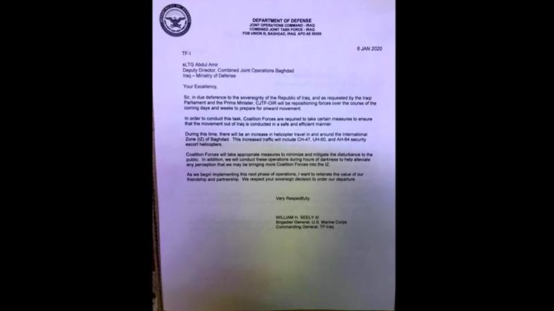 พล.ร.จัตวาวิลเลียม ซีลี ของกองทัพเรือสหรัฐส่งจดหมายลงวันที่ 5 มกราคมตามเวลาสหรัฐถึงอิรักว่า เคารพการตัดสินใจตามอธิปไตยของอิรักที่สั่งให้ทหารอเมริกันออกจากอิรัก และเพื่อดำเนินการในเรื่องนี้ กองกำลังพันธมิตรนำโดยสหรัฐจะต้องดำเนินมาตรการบางอย่างเพื่อสร้างหลักประกันว่าการเคลื่อนกำลังพลออกจากอิรักจะเป็นไปอย่างปลอดภัยและมีประสิทธิภาพ ฝูงบินเฮลิคอปเตอร์จะบินเข้าออกเขตกรีนโซนในกรุงแบกแดดซึ่งเป็นที่ตั้งสถานทูตสหรัฐเพื่อเตรียมการถอนทหาร เอเอฟพีรายงานว่า ได้ยินเสียงฝูงบินเฮลิคอปเตอร์เหนือกรุงแบกแดดตลอดคืนที่ผ่านมา และว่าทั้งเจ้าหน้าที่สหรัฐและอิรักต่างยืนยันว่าเป็นจดหมายจริง