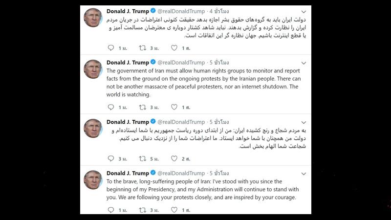 ประธานาธิบดีทรัมป์ทวีตสองข้อความเป็นภาษาอังกฤษและภาษาฟาร์ซีหรือภาษาเปอร์เซียที่ใช้ในอิหร่าน ข้อความแรกทวีตว่า ถึงชาวอิหร่านที่กล้าหาญและทนทุกข์มานาน เขาอยู่ข้างชาวอิหร่านตั้งแต่ขึ้นเป็นประธานาธิบดี รัฐบาลของเขาจะอยู่ข้างชาวอิหร่านต่อไป ขณะนี้กำลังติดตามการประท้วงของชาวอิหร่านอย่างใกล้ชิดและได้รับแรงบันดาลใจจากความกล้าหาญของชาวอิหร่าน ข้อความหลังทวีตว่า รัฐบาลอิหร่านจะต้องอนุญาตให้กลุ่มสิทธิมนุษยชนสังเกตการณ์และรายงานข้อเท็จจริงจากจุดที่ชาวอิหร่านกำลังประท้วงอยู่ ห้ามสังหารหมู่ผู้ประท้วงอย่างสันติครั้งใหม่หรือตัดการเชื่อมต่ออินเทอร์เน็ต ทั้งโลกกำลังจับตาดูอยู่