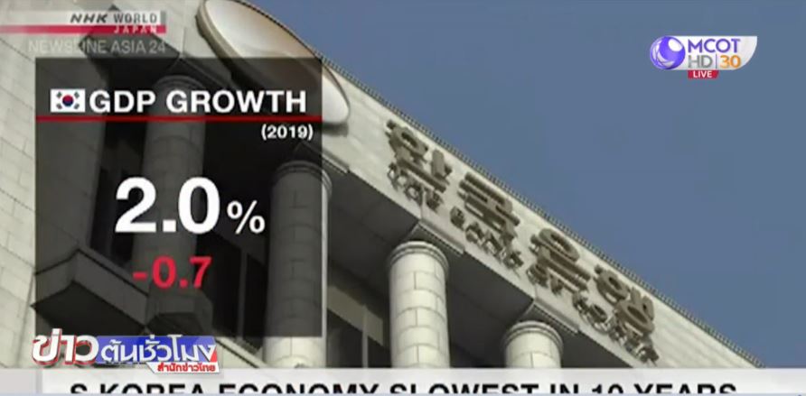 เกาหลีใต้ 22 ม.ค.-รายงานเบื้องต้นของธนาคารกลางเกาหลีใต้ เผยเศรษฐกิจเกาหลีใต้เมื่อปี 2562 มีการขยายตัวเพียงร้อยละ 2 นับเป็นการขยายตัวทางเศรษฐกิจที่น้อยที่สุดของประเทศในรอบ 10 ปี