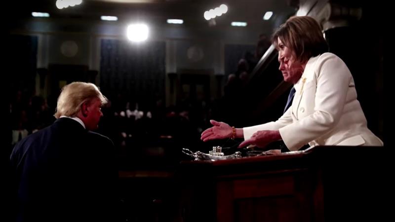 วอชิงตัน 5 ก.พ.- ประธานาธิบดีโดนัลด์ ทรัมป์ของสหรัฐแถลงนโยบายประจำปีต่อรัฐสภาเป็นครั้งที่สามของการดำรงตำแหน่งสมัยปัจจุบัน แต่ไม่ยอมจับมือนางแนนซี เปโลซี ประธานสภาผู้แทนราษฎรพรรคเดโมแครตที่ยื่นมาให้ก่อนที่เขาจะเริ่มการแถลง