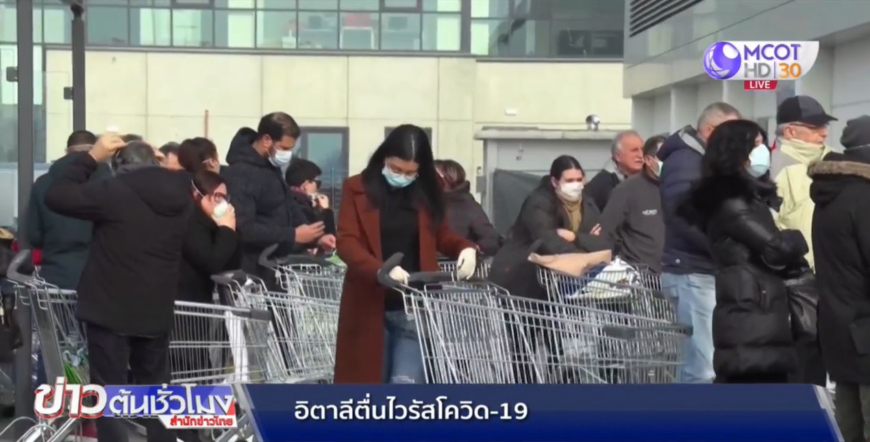 ชาวอิตาลีในหลายเมืองของแคว้นลอมบาร์ดี ทางภาคเหนือ ต่างสวมหน้ากากอนามัย ขณะออกมาซื้ออาหารและสินค้าจำเป็นที่ซูเปอร์มาร์เก็ตไปกักตุน ท่ามกลางความวิตกกังวลกับสถานการณ์แพร่ระบาดเชื้อไวรัสโคโรนาสายพันธุ์ใหม่ หลังทำให้มีผู้เสียชีวิตในอิตาลีไปแล้ว 2 คน ติดเชื้อมากกว่า 100 คน ทั้งหมดอยู่ในแคว้นลอมบาร์ดีและเวเนโตทางตอนเหนือ ส่วนหลายเมืองรวมถึงนครมิลานต้องประกาศเตือนให้ประชาชนอยู่แต่ในบ้านเรือน และประกาศยกเลิกการแข่งขันกีฬาหลายรายการ รวมถึงการแข่งขันฟุตบอลกัลโช่ เซเรีย อา 3 นัดในคืนวันอาทิตย์.-สำนักข่าวไทย