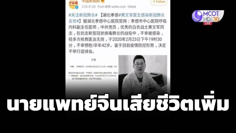 สถานการณ์การแพร่ระบาดของโรคโควิด-19 ล่าสุดพบผู้เสียชีวิตใหม่ในจีน อีก 150 คน ส่งผลให้ยอดผู้เสียชีวิตเพิ่มขึ้นเป็น 2,592 คน ในจำนวนนี้รวมผู้เสียชีวิตในเขตปกครองพิเศษของจีน ได้แก่ ฮ่องกง 2 คน และไต้หวันอีก 1 คน ส่วนผู้ติดเชื้อรายใหม่มี 409 คน ยอดผู้ติดเชื้อรวมเพิ่มเป็น 77,048 คน ขณะที่ยอดผู้เสียชีวิตจากประเทศอื่นๆ รวมแล้วมีอย่างน้อย 22 คน และพบติดเชื้อที่ 1,712 คน ซึ่ง 1 ในผู้เสียชีวิตที่เพิ่มขึ้น คือ คุณหมอหวงเหวิน จวิน วัย 42 ปี โรงพยาบาลเมืองเซี่ยวก่าน มณฑลหูเป่ย์ เสียชีวิตจากการติดเชื้อนี้ เมื่อวันที่ 23 ก.พ.63 19.30น.ตามเวลาของจีน ตามประกาศของโรงพยาบาลเมืองเซี่ยวก่าน