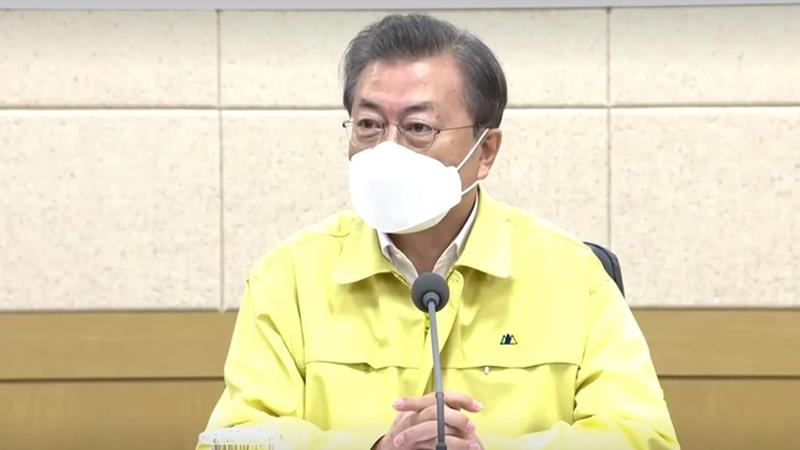 ขณะเดียวกันประธานาธิบดีมุนกล่าวในการประชุมคณะรัฐมนตรีและเจ้าหน้าที่สาธารณสุขที่สวมหน้ากากอนามัยกันทุกคนในวันนี้ว่า วิกฤตในเมืองแทกูและจังหวัดคยองซังเหนือถึงจุดสูงสุดแล้ว ทั้งประเทศกำลังทำสงครามกับโรคติดเชื้อนี้ ขอให้หน่วยงานรัฐบาลทุกแห่งทำงานตลอด 24 ชั่วโมงเพราะต้องเพิ่มความเตรียมพร้อมในการกักดูอาการและดำเนินมาตรการต่าง ๆ ที่เกี่ยวข้องกับเศรษฐกิจ