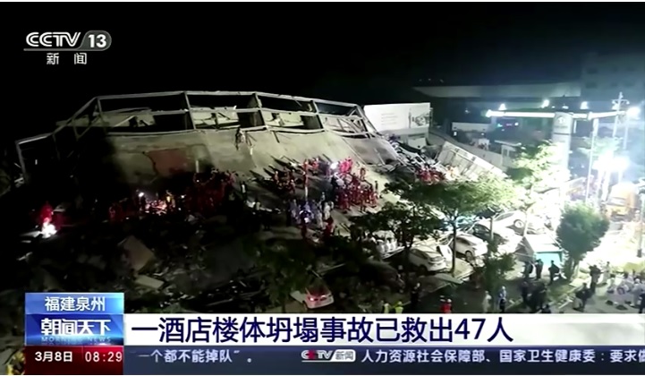 กระทรวงกล่าวว่า โรงแรมเริ่มพังถล่มเมื่อตอนเย็นวันเสาร์และเมื่อเวลา 16.00 น. ตามเวลาท้องถิ่น เจ้าหน้าที่สามารถนำตัวผู้ที่ติดอยู่ภายในซากอาคารออกมาได้ 48 ราย แต่ในจำนวนนี้ มีเป็นผู้ที่เสียชีวิต 10 ราย อีก 38 รายถูกส่งไปรักษาตัวที่โรงพยาบาล ซึ่งมีเด็กชายอายุ 12 ปี รวมอยู่ด้วย ส่วนอีก 1 คน ไม่ได้รับบาดเจ็บใด ๆ ขณะนี้เจ้าหน้าที่กำลังค้นหาผู้ที่ยังสูญหายไปอีก 23 ราย ในขณะที่เจ้าหน้าที่กู้ภัยเข้าช่วยเหลือ ได้มีการพ้นสเปรย์ฆ่าเชื้อให้กันและกัน ซึ่งเป็นส่วนหนึ่งของมาตรการป้องกันการปนเปื้อนเชื้อโรคด้วย สำนักข่าวซินหัวของทางการจีนรายงานว่า เจ้าของอาคารนามสกุลหยาง ถูกตำรวจเรียกตัวมาสอบปากคำ ซินหัวรายงานด้วยว่า ชั้น 1 ของอาคาร 7 ชั้น กำลังอยู่ในระหว่างการปรับปรุงในช่วงที่พังถล่มลงมา ในขณะที่เกิดเหตุถล่ม มีผู้อยู่ในโรงแรม 71 คน จำนวนนี้ 58 คนเป็นผู้ที่ถูกกักตัวเพื่อดูอาการ.-สำนักข่าวไทย