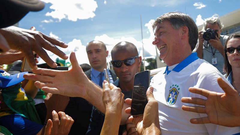 ประธานาธิบดีโบวโซนารู วัย 64 ปี ออกมาพบกลุ่มสนับสนุนที่ประตูหน้าทำเนียบประธานาธิบดีเมื่อวันอาทิตย์ตามเวลาท้องถิ่น ชนกำปั้นทักทาย แล้วใช้สมาร์ทโฟนถ่ายภาพหมู่กับกลุ่มผู้สนับสนุน เขาถ่ายทอดสดเหตุการณ์นี้ในเฟซบุ๊กที่เป็นบัญชีทางการ และระบุว่า การที่ประชาชนออกมาชุมนุมสนับสนุนนโยบายของเขามากมายเช่นนี้เป็นสิ่งที่ไม่สามารถประเมินค่า แม้เขาขอให้เลื่อนการชุมนุมออกไปก่อน แต่ก็ไม่สามารถสั่งการอะไรได้เพราะประชาชนออกมากเอง ถึงแม้สื่อ ไวรัส หรือคำแนะนำใด ๆ ห้ามไว้ก็ตาม