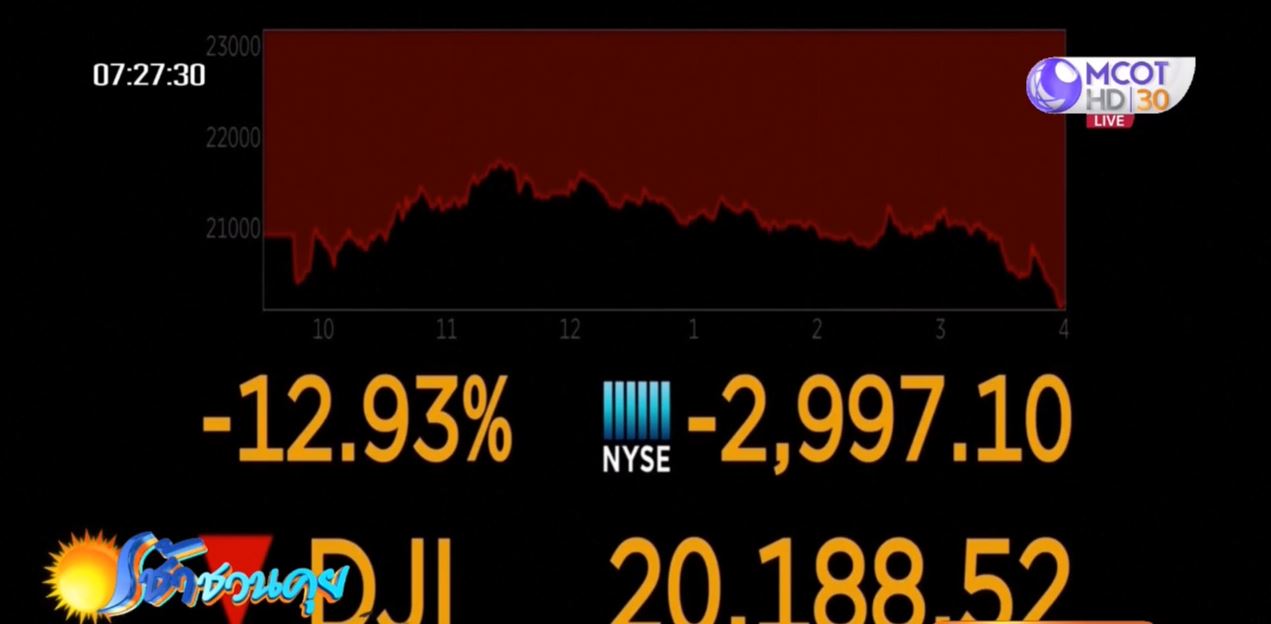 ดัชนีอุตสาหกรรมดาวโจนส์ ปิดตลาดวานนี้ ลดลง 2,997 จุด หรือเกือบ 13% หนักที่สุดนับตั้งแต่ปี 2530 หลังจากประธานาธิบดีโดนัลด์ ทรัมป์ ผู้นำสหรัฐ ออกมาบอกว่าพิษสงของโควิด-19 อาจทำให้เศรษฐกิจสหรัฐเข้าสู่ภาวะถดถอยอย่างหลีกเลี่ยงไม่ได้