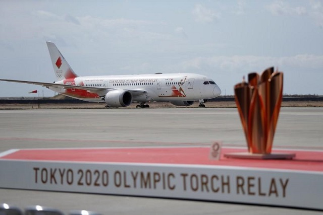 ไฟโอลิมปิก เดินทางด้วยเครื่องบินเช่าเหมาลำเที่ยวบินพิเศษลงจอดที่สนามบินมัตสึชิมะ ซึ่งเป็นฐานทัพของกองกำลังป้องกันตนเองของญี่ปุ่นที่จังหวัดมิยากิ ซึ่งเป็นจุดที่เป็นการเลือกสรรอย่างตั้งใจ เพื่อเป็นส่วนหนึ่งของการแสดงให้เห็นถึงการฟื้นตัวของจุดที่เกิดแผ่นดินไหว สึนามิและโรงไฟฟ้านิวเคลียร์เสียหายเมื่อปี 2011 แต่เด็ก ๆ ในท้องถิ่นราว 200 คนที่มีการเตรียมการไว้เพื่อต้อนรับไฟโอลิมปิก ไม่ได้มาร่วมงานตามมาตรการป้องกันการระบาดของโควิด-19 ที่มีผู้ติดเชื้อในญี่ปุ่นราว 900 คน การวิ่งคบเพลิงโอลิมปิก กำหนดจะเริ่มขึ้นในวันที่ 26 มีนาคม เริ่มจากศูนย์กีฬาเจ-วิลเลจ ที่เมืองฟูกูชิมะ ซึ่งเคยเป็นศูนย์บัญชาการในการรับมือเมื่อครั้งเกิดสารกัมมันตรังสีรั่วไหลจากโรงไฟฟ้าพลังงานนิวเคลียร์ รัฐบาลญี่ปุ่นประกาศว่า มีความมุ่งมั่นที่จะจัดการแข่งขันโอลิมปิกที่ “ปลอดภัยและมั่นใจได้” ที่กรุงโตเกียวตามกำหนดที่ได้วางไว้ หลังจากที่ประธานาธิบดีโดนัลด์ ทรัมป์ ของสหรัฐ แนะนำให้เลื่อนแข่งขันออกไปอีก 1 ปี เนื่องจากการระบาดของโควิด-19.-สำนักข่าวไทย