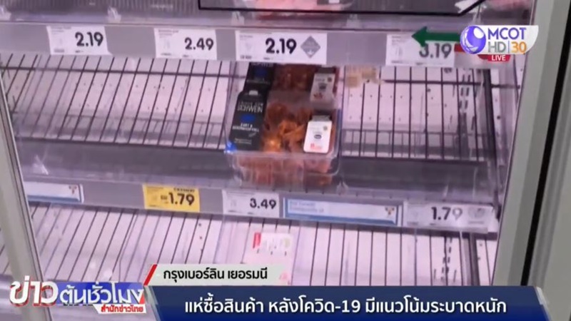 ผู้คนในกรุงเบอร์ลินของเยอรมนีพากันออกมาซื้อข้าวของจำเป็นตามซูเปอร์มาร์เก็ต ทำให้สินค้าหลายอย่างหมดจากชั้นวางอย่างรวดเร็ว จนพนักงานต้องแจ้งลูกค้าว่าให้มาซื้อในวันหลัง สถานการณ์แพร่ระบาดของเชื้อโควิด-19 ในเยอรมนีซึ่งมีแนวโน้มจะรุนแรงขึ้น ทำให้ประชาชนแห่ตุนอาหารและของใช้จำเป็น สินค้าขายดี ได้แก่ ข้าว แป้ง น้ำมันพืช นม กระดาษชำระ หน้ากากอนามัย และน้ำยาฆ่าเชื้อ