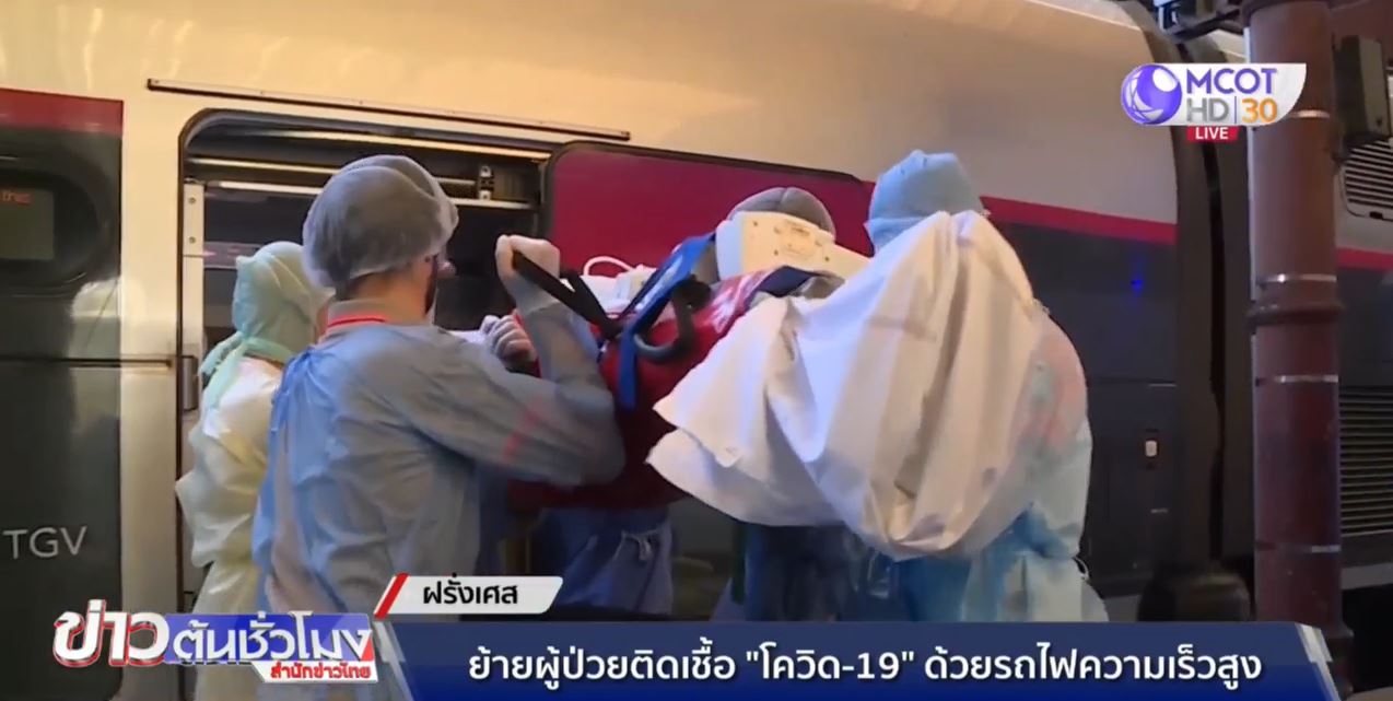 ฝรั่งเศส 26 มี.ค.-ทางการฝรั่งเศส เคลื่อนย้ายผู้ป่วยโรคโควิด-19 จำนวน 20 คน ไปรักษาตัวที่โรงพยาบาลในพื้นที่อื่น ด้วยรถไฟความเร็วสูง พร้อมแพทย์-พยาบาล ดูแลใกล้ชิดตลอดการเดินทาง