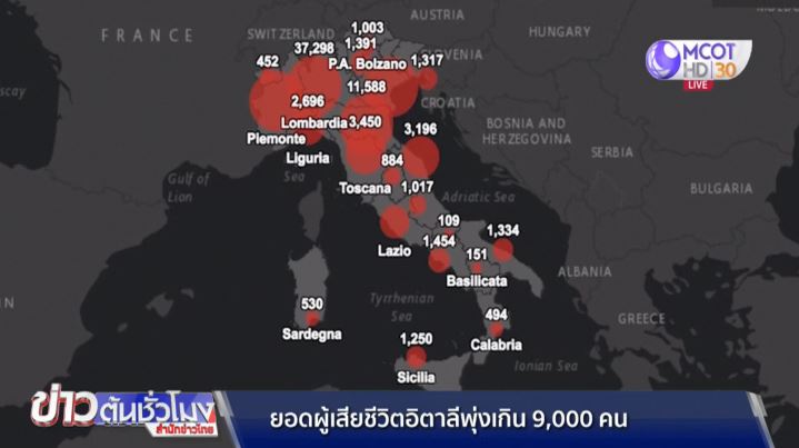 อิตาลียังวิกฤต ล่าสุดมีผู้เสียชีวิตจากโควิด-19 เพิ่มอีก 969 คน ทำให้ยอดรวมเพิ่มเป็น 9,134 คน นับเป็นจำนวนผู้เสียชีวิตมากที่สุดในโลก ส่วนผู้ติดเชื้อมีราว 86,500 คน มากเป็นอันดับ 2 รองจากสหรัฐ ตลอดหลายวันที่ผ่านมาทางการได้ใช้มาตรการปิดเมืองทั่วประเทศ เพื่อลดการเดินทางของประชาชน รวมทั้งสั่งปิดร้านค้าที่ไม่จำเป็น เพื่อควบคุมการแพร่ระบาดของโรค ส่วนผู้ฝ่าฝืนมาตรการของรัฐจะมีโทษปรับหนักมาก.-สำนักข่าวไทย