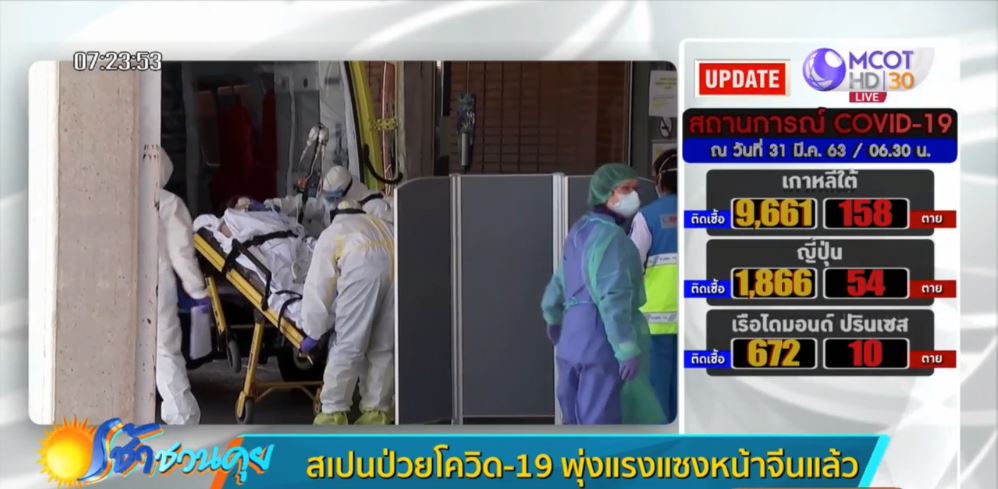 สเปน 31 มี.ค.- จำนวนผู้ป่วยโรคติดเชื้อไวรัสโคโรนา 2019 หรือโควิด-19 ในสเปน พุ่งขึ้นอย่างรวดเร็วเป็น 85,195 คน แซงหน้าจีนที่มีอยู่ 81,470 คนแล้ว แม้รัฐบาลสเปนจะใช้มาตรการปิดเมืองมานานถึง 2 สัปดาห์แล้วก็ตาม