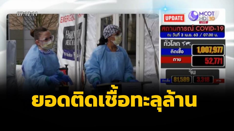 3 เม.ย.-ตัวเลขผู้ติดเชื้อไวรัสโคโรนา หรือโควิด-19 ทั่วโลก ทะลุเกิน 1 ล้านคนแล้ว ผู้เสียชีวิตมากกว่า 52,000 คน ผู้ติดเชื้อหายป่วยมากกว่า 209,164 คน ขณะที่สหรัฐผู้คนต้องตกงานแล้วมากกว่า 6.6 ล้านคน