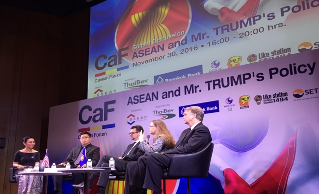 หนึ่งในประเด็นสำคัญ ของวงเสวนาดังกล่าว คือ กรณีที่นายทรัมป์ ประกาศจะนำสหรัฐถอนตัวจากการเป็นสมาชิกความตกลงหุ้นส่วนยุทธศาสตร์เศรษฐกิจ หรือ TPP ซึ่งอาจจะส่งผลกระทบทางเศรษฐกิจต่อชาติสมาชิกอาเซียน โดยเฉพาะประเทศที่ร่วมเป็นภาคี ของ TPP ซึ่งได้แก่เวียดนาม สิงคโปร์ บรูไน และมาเลเซีย ทั้งนี้ ผู้ร่วมเสวนา มีความเห็นไปในทิศทางเดียวกันว่า การตัดสินใจของนายโดนัลด์ ทรัมป์จะเป็นผลเสียต่อสหรัฐมากกว่า เนื่องจากทำให้สหรัฐเสียโอกาสทางการค้าการลงทุนในเอเชียตะวันออกเฉียงใต้ ซึ่งเป็นภูมิภาคที่กำลังเต็มไปด้วยช่องทางที่สดใส ดังนั้นจึงเป็นไปได้ที่สหรัฐ อาจจะเจรจาเพื่อทบทวนข้อตกลงกันใหม่กับอีก 11 ประเทศสมาชิก TPP