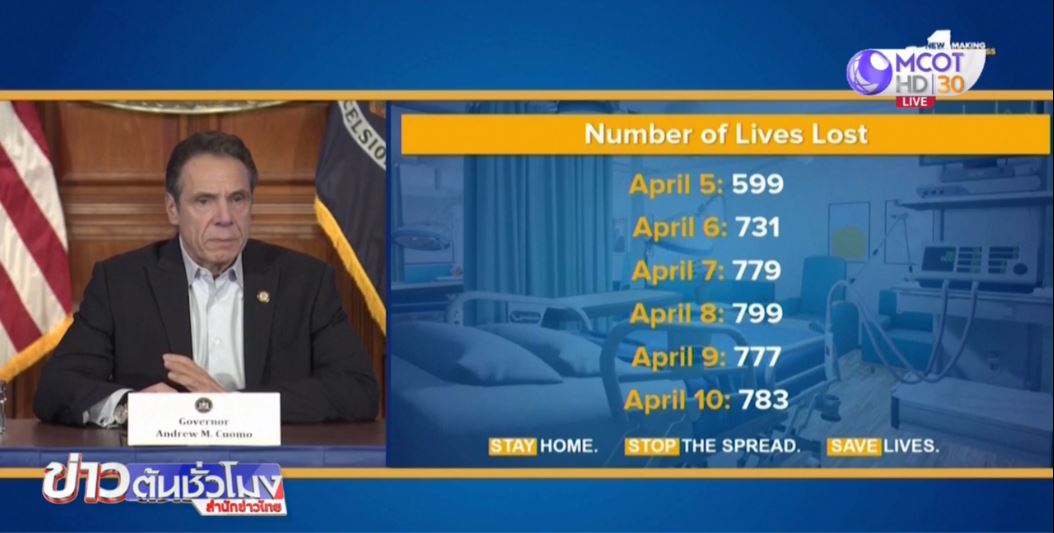 นายแอนดรูว์ คัวโม ผู้ว่าการรัฐนิวยอร์ก แถลงวานนี้ว่า จำนวนผู้ป่วยโควิด-19 ที่รักษาตัวอยู่ในโรงพยาบาลและห้องไอซียู ยังคงลดลงต่อเนื่อง แม้ในนิวยอร์กเป็นรัฐที่มีผู้ป่วยถึง 40% ของผู้ป่วยในสหรัฐ และจำนวนผู้ติดเชื้อรายใหม่ แม้จะยังมีจำนวนสูง แต่ก็ลดลงเช่นกัน