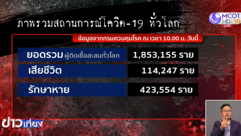 13 เม.ย. – ภาพรวมสถานการณ์โควิด-19 ทั่วโลก ข้อมูล ณ เวลา 10.00 น. วันนี้ (13 เม.ย.) ยอดรวมผู้ติดเชื้อสะสมทั่วโลก 1,853,155 ราย เสียชีวิต 114,247 ราย รักษาหาย 423,554 ราย