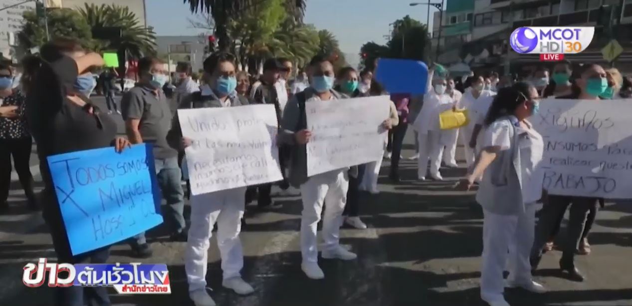รัฐบาลเม็กซิโกกำลังเผชิญกับกระแสการชุมนุมประท้วงแสดงความไม่พอใจปัญหาการขาดแคลนอุปกรณ์ป้องกัน ขณะที่มีรายงานว่า เมื่อสัปดาห์ที่แล้ว บุคลากรทางการแพทย์ 24 คน ของโรงพยาบาลรัฐบาลแห่งหนึ่งติดเชื้อโควิด-19 เม็กซิโกพบผู้ติดเชื้อที่ได้รับการยืนยันแล้วกว่า 5,000 คน เสียชีวิต 332 คน. – สำนักข่าวไทย