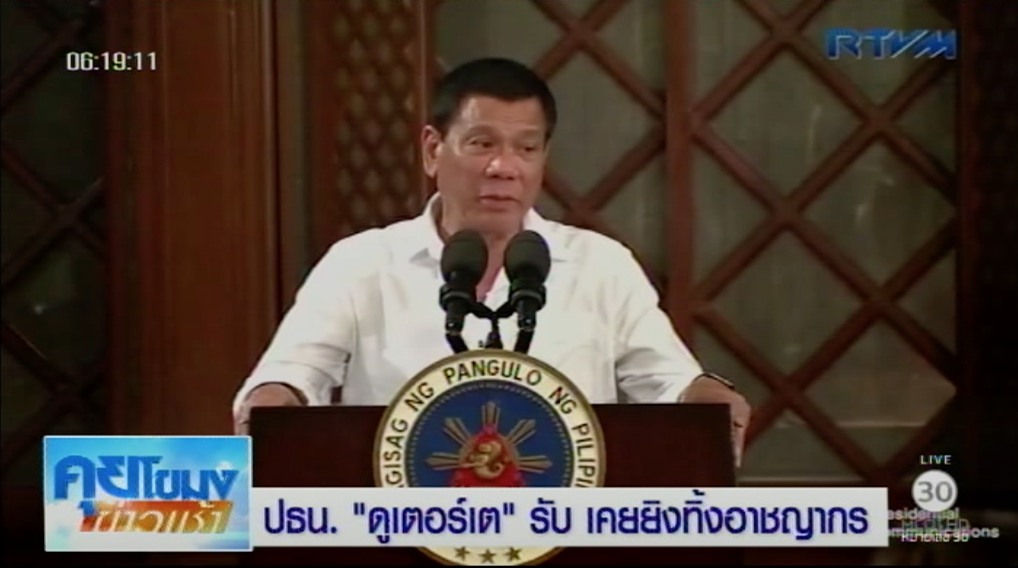 ฟิลิปปินส์ 15 ธ.ค.- ประธานาธิบดีโรดริโก ดูเตอร์เต ผู้นำฟิลิปปินส์ ยอมรับว่าเคยสังหารผู้ต้องสงสัยว่าเป็นอาชญากรด้วยตนเองสมัยดำรงตำแหน่งนายกเทศมนตรีเมืองดาเวา