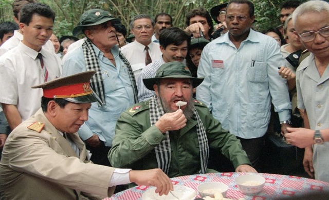 นายฟิเดล คาสโตรปรากฏตัวพร้อมกับซิการ์ที่สมรภูมิรบเมื่อปี 2516 ในระยะที่สงครามเวียดนามเข้าสู่ช่วงดุเดือดที่สุด ซึ่งเป็นการเยือนเพื่อแสดงไมตรีกันระหว่างประเทศพันธมิตรในยุคสงครามเย็น นายคาสโตร อดีตผู้นำคิวบาวัย 90 ปี ซึ่งถึงแก่อสัญกรรมเมื่อวันศุกร์ ได้รับการยกย่องจากเวียดนาม โดยมีทั้งวัยรุ่นและผู้ใหญ่ที่มาร่วมแสดงความอาลัย นางเหวียน ถิ เฮือง วัย 60 ปีย้อนรำลึกสมัยอายุ 17 ปีในจังหวัดกวางตรีที่สหรัฐทิ้งระเบิดดาวกระจายถล่มเวียดนาม ส่วนตัวเธอได้รับบาดเจ็บสาหัสจากเศษกระสุนที่กระจายทั่วร่างและเสียเลือดมากจนเกือบสลบ ก่อนหมดสติเธอเห็นชายร่างสูงเหมือนชาวตะวันตกและไว้เคราพาเธอขึ้นรถนำส่งยังโรงพยาบาลใกล้เคียงและทำให้เธอรอดชีวิตมาได้ นางเฮืองซึ่งปัจจุบันเป็นเกษตรกรกล่าวทั้งน้ำตาว่า นับถือฟิเดล คาสโตรเหมือนบิดา หากไม่มีเขาช่วยไว้เธอคงตายไปตั้งแต่ 43 ปีก่อน และเศร้าใจเมื่อได้ข่าวว่าคาสโตรจากไปแล้ว