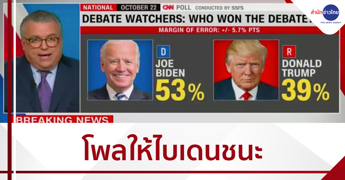 แอตแลนตา 23 ต.ค.- ซีเอ็นเอ็น (CNN) สำรวจความเห็นผู้ชมทันทีที่เสร็จสิ้นการถ่ายทอดสดการดีเบตนัดสุดท้ายระหว่างประธานาธิบดีโดนัลด์ ทรัมป์ จากพรรครีพับลิกันและนายโจ ไบเดนจากพรรคเดโมแครต ผู้ตอบให้ไบเดนชนะทรัมป์ร้อยละ 53 ต่อ 39
