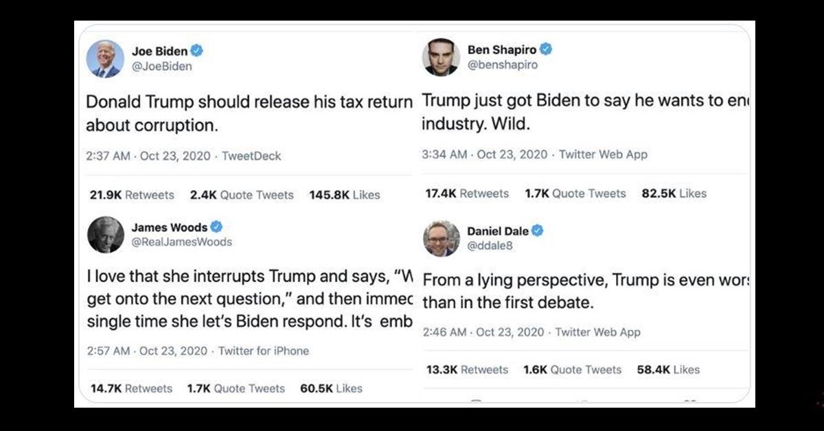 ทวีตยอดนิยมอันดับสองเป็นของเบนจามิน ชาปิโร นักวิจารณ์การเมืองสายอนุรักษ์นิยมวัย 36 ปี ที่ให้ทรัมป์ชนะในหัวข้อการเปลี่ยนแปลงสภาพภูมิอากาศเพราะสามารถกดดันจนไบเดนยอมรับว่าต้องการเลิกอุตสาหกรรมน้ำมัน ทวีตยอดนิยมอันดับสามเป็นของเจมส์ วูดส์ นักแสดงและผู้อำนวยการสร้างภาพยนตร์วัย 73 ปี ที่กล่าวหาคริสเทน เวลเกอร์ ผู้ดำเนินรายการดีเบตว่า เข้าข้างไบเดนด้วยการขัดจังหวะทรัมป์ว่าต้องเปลี่ยนไปคุยหัวข้อถัดไป แต่กลับปล่อยให้ไบเดนได้ตอบทุกครั้ง และทวีตยอดนิยมอันดับสี่เป็นของแดเนียล เดล ผู้ตรวจสอบข้อเท็จจริงของซีเอ็นเอ็น (CNN) วัย 35 ปี ที่กล่าวหาทรัมป์ว่าโกหกยิ่งกว่าดีเบตนัดแรก.-สำนักข่าวไทย