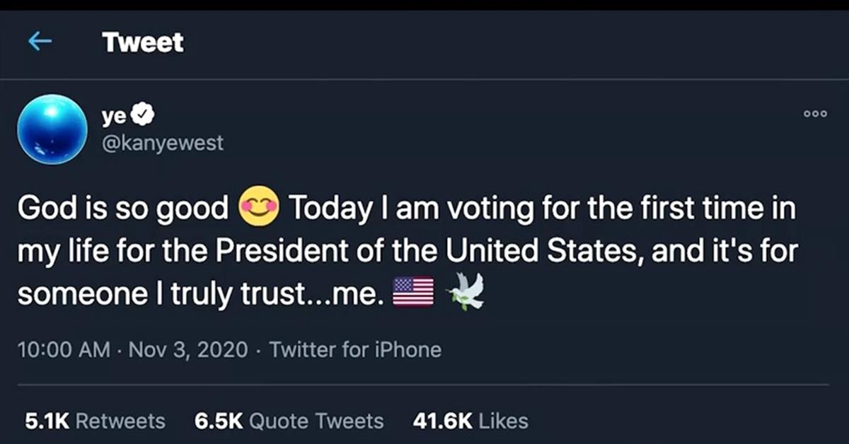 เวสต์วัย 43 ปี ทวีตเมื่อค่ำวันอังคารตามเวลาสหรัฐว่า กำลังลงคะแนนเลือกประธานาธิบดีสหรัฐอเมริกาเป็นครั้งแรกในชีวิต และลงให้คนที่เขาเชื่ออย่างหมดใจนั่นคือตัวเอง เขาทวีตภาพถ่ายตัวเองหน้าแผนที่เลือกตั้งและลงข้อความว่า WELP, KANYE 2024 ส่อนัยว่าอยากจะลงเลือกตั้งในสมัยหน้า และภาพบัตรลงคะแนนที่เขียนชื่อตัวเองเป็นประธานาธิบดี และมิเชลล์ ทิดบอลล์ สตรีวัย 57 ปี ที่นิยามตัวเองว่าเป็นไลฟ์โค้ชคัมภัร์ไบเบิลเป็นรองประธานาธิบดี นอกจากนี้ยังได้โพสต์คลิปกำลังสอดบัตรคะแนนในเครื่องลงคะแนนในเมืองโคดี รัฐไวโอมิง ทางตะวันตกของประเทศ ยืนยันการลงคะแนนอย่างเป็นทางการ พร้อมถ้อยคำว่า เชื่อในคานเย 2020 ต่อไป ขอบคุณพระเยซูคริสต์ นักร้องเจ้าของรางวัลแกรมมี 21 ครั้ง ประกาศตัวในเดือนกรกฎาคมว่าจะลงชิงประธานาธิบดีแต่หาเสียงอย่างไม่อยู่กับร่องกับรอย จุดกระแสเรื่องมีปัญหาสุขภาพจิตหรือไม่ เพราะเคยบอกในปี 2561 ว่ามีปัญหาอารมณ์แปรปรวน
