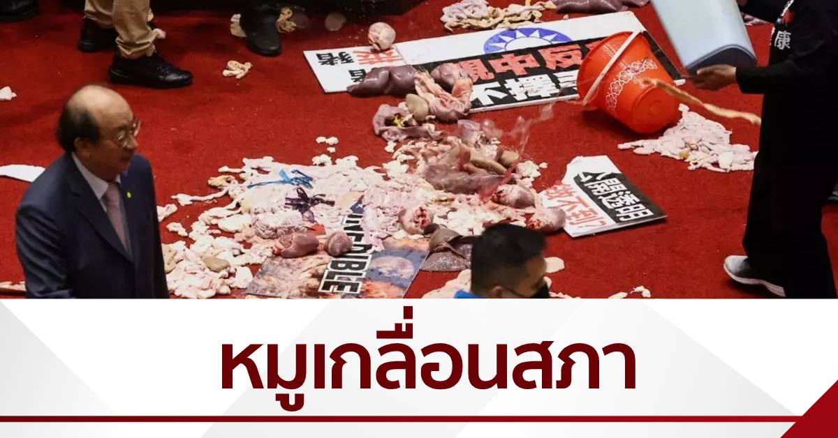 ไทเป 27 พ.ย. – สส. ฝ่ายค้านไต้หวันปาเครื่องในหมูในรัฐสภา เพื่อคัดค้านรัฐบาลที่ตัดสินใจผ่อนปรนข้อจำกัดการนำเข้าเนื้อหมูจากสหรัฐ