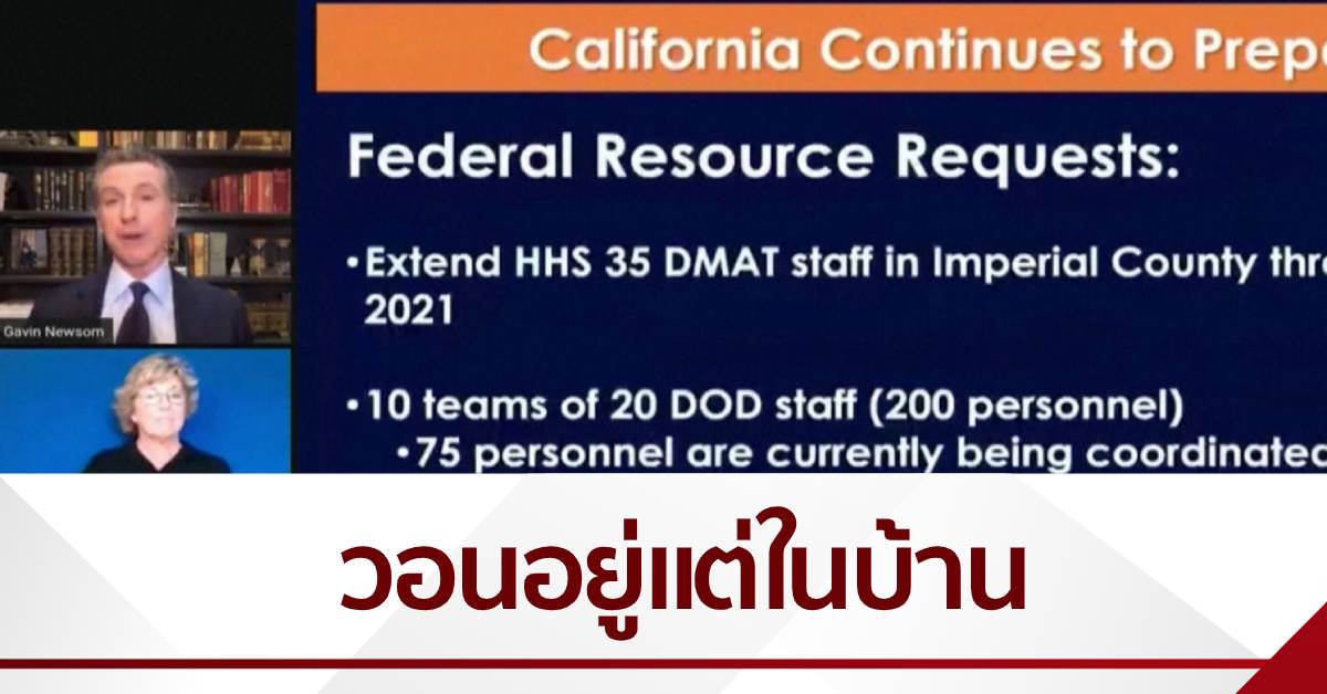 สหรัฐ 22 ธ.ค.-ผู้ว่าการรัฐแคลิฟอร์เนีย ขอชาวแคลิฟอร์เนีย ปฏิบัติตามคำสั่งให้อยู่แต่ในบ้านอย่างเคร่งครัด และอาจขยายเวลาคำสั่งให้อยู่แต่ในบ้านออกไปอีก ย้ำเชื้อโควิด-19 ในแคลิฟอร์เนียไม่ใช่สายพันธุ์ใหม่เหมือนในอังกฤษ