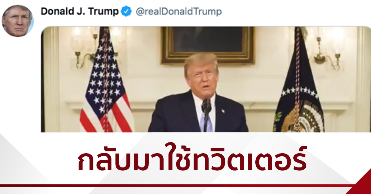 วอชิงตัน 8 ม.ค. – ประธานาธิบดีโดนัลด์ ทรัมป์ ของสหรัฐ กลับมาใช้งานทวิตเตอร์อีกครั้ง ด้วยการโพสต์วิดีโอคลิปที่เขากล่าวยอมรับว่านายโจ ไบเดน จะเป็นประธานาธิบดีสหรัฐคนต่อไป ในขณะที่สื่อสังคมออนไลน์อื่น ๆ รวมถึงเฟซบุ๊กยังคงปิดกั้นการใช้งานของเขา เนื่องจากเกรงว่าข้อความของเขาจะทำให้เกิดการประท้วงรุนแรงอีก