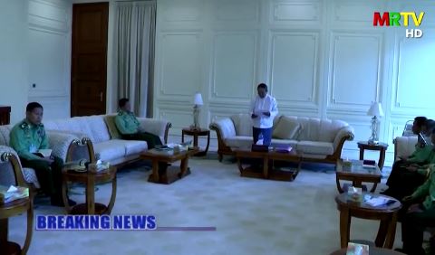 เมียนมา 1 ก.พ. – สื่อทางการเมียนมาเผยแพร่ภาพ รก.ประธานาธิบดี พบผู้นำกองทัพ มิน อ่อง หล่าย อยู่ในภาพด้วย