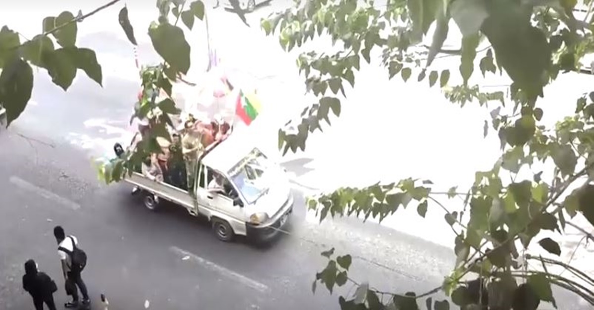 ขณะเดียวกันมีกลุ่มชาวเมียนมาแต่งกายชุดลายพรางยืนโบกธงชาติอยู่บนรถยนต์ ส่งเสียงร้องพร้อมกันว่า “ขอให้พลเอกอาวุโสมิน อ่อง หล่าย มีสุขภาพแข็งแรง” ในระหว่างที่พวกเขาขับรถผ่านย่านใจกลางเมืองย่างกุ้ง ทั้งนี้ กองทัพเมียนมาอ้างว่าการควบคุมตัวนางออง ซาน ซู จี และแกนนำพรรคเอ็นแอลดีเป็นผลมาจากการทุจริตเลือกตั้ง จากนั้นได้ประกาศมอบอำนาจปกครองประเทศให้แก่พลเอกอาวุโสมิน อ่อง หล่าย และประกาศสถานการณ์ฉุกเฉินเป็นเวลา 1 ปี. -603