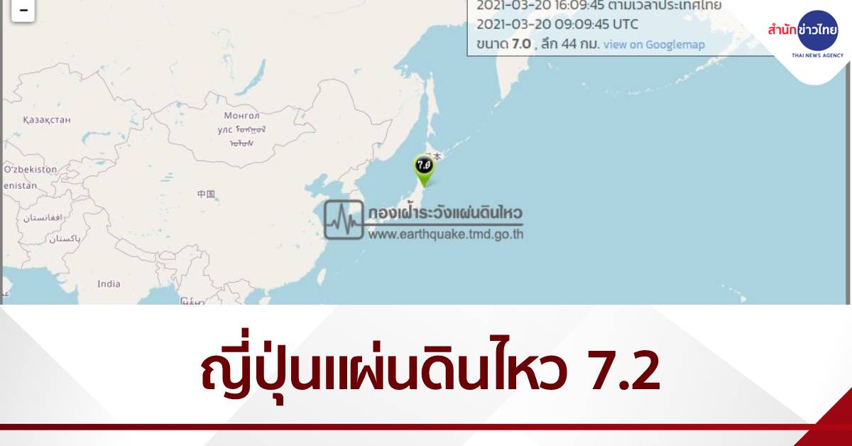 โตเกียว 20 มี.ค.-สำนักงานอุตุนิยมวิทยาญี่ปุ่นรายงานว่า เกิดแผ่นดินไหวขนาด 7.2 นอกชายฝั่งทางตะวันออกเฉียงเหนือของญี่ปุ่น ประกาศเตือนสึนามิ
