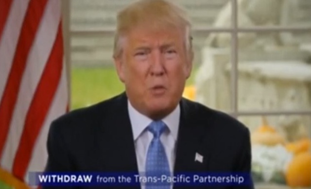 วอชิงตัน 22 พ.ย.- นายโดนัลด์ ทรัมป์ประกาศเมื่อวันจันทร์ตามเวลาสหรัฐว่า จะถอนตัวจากข้อตกลงความเป็นหุ้นส่วนข้ามหาสมุทรแปซิฟิก (ทีพีพี) ตั้งแต่วันแรกที่เข้ารับตำแหน่ง เป็นหนึ่งในมาตรการเร่งด่วน 6 ขั้นที่จะทำให้สหรัฐอเมริกามาก่อน