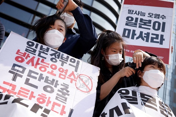 เจ้าหน้าที่ตำรวจพยายามเข้าสลายกลุ่มผู้ชุมนุมเป็นระยะ ๆ แต่ก็ไม่ได้ดำเนินการอย่างเด็ดขาดในการห้ามการประท้วง บรรดาผู้ประท้วงที่โกนศีรษะห่อหุ้มตัวเองด้านแผ่นกระดาศขนาดใหญ่ที่มีช้อความประณามแผนการของรัฐบาลญี่ปุ่นและเรียกร้องให้ยกเลิกแผนการนี้ ข้อความหนึ่งเขียนว่า รัฐบาลญี่ปุ่นควรยกเลิกแผนการปล่อยน้ำปนเปื้อนสารกัมมันตรังสีจากโรงไฟฟ้าลงทะเลในทันที รัฐบาลญี่ปุ่นแจ้งเมื่อสัปดาห์ที่แล้วว่า จะปล่อยน้ำปริมาณมากกว่า 1 ล้านตัน ซึ่งเป็นน้ำที่ได้รับการบำบัดแล้วจากโรงไฟฟ้าพลังงานนิวเคลียร์ที่เมืองฟุกุชิมะ โดยจะทะยอยปล่อยน้ำเป็นระยะเวลารวมแล้วประมาณ 2 ปี หลังจากเก็บกักไว้นานเป็นสิบปี นับตั้งแต่เหตุการณ์แผ่นดินไหวและสึนามิครั้งใหญ่เมื่อเดือนมีนาคม 2011