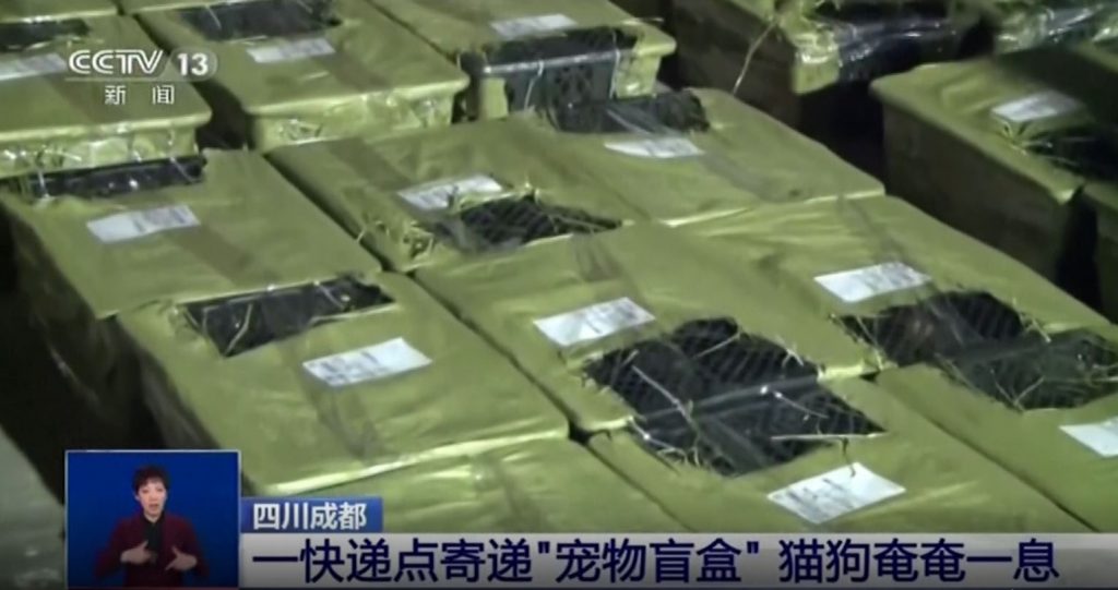 สถานีโทรทัศน์ซีซีทีวีรายงานว่าเมื่อวันจันทร์ เจ้าหน้าที่สามารถช่วยชีวิตลูกสุนัขและแมวจำนวนกว่า 160 ตัว จากโกดังสินค้าในเมืองเฉิงตู มณฑลเสฉวน หลังจากพวกมันถูกนำมาลักลอบจำหน่ายผ่าน blind boxes หรือกล่องสุ่ม ผู้ค้าท้องถิ่นซึ่งโพสต์ขายสัตว์เลี้ยงผ่านทางออนไลน์ นำสัตว์เลี้ยงเหล่านี้แพ็กกล่องพัสดุ ที่ภายนอกดูเหมือนกับกล่องส่งสินค้าแบบด่วนพิเศษทั่วไป เพื่อเตรียมส่งไปจำหน่ายทั่วประเทศ โชคดีที่อาสาสมัครด้านสวัสดิภาพสัตว์ได้ให้เบาะแสแก่เจ้าหน้าที่ สามารถช่วยชีวิตสัตว์เหล่านี้ออกมาได้ โชคร้ายมีสัตว์ 4 ตัวตายลง และอีกหลายตัวติดเชื้อไวรัส ขณะนี้ตำรวจอยู่ระหว่างการสอบสวน