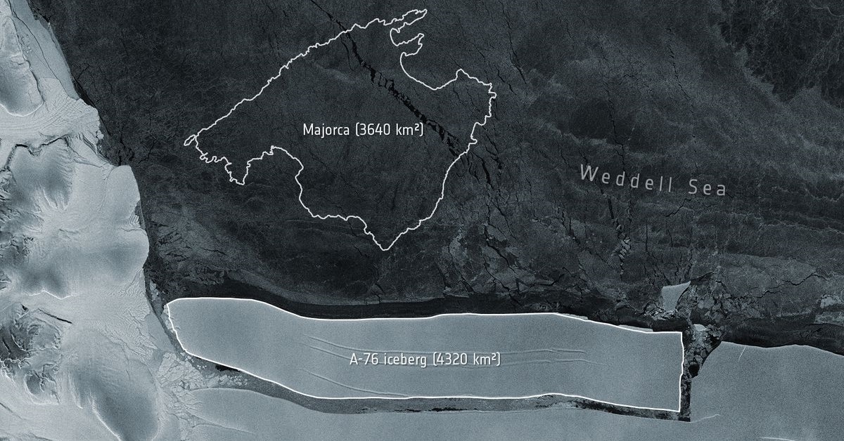 องค์การอวกาศยุโรป (อีเอสเอ) ระบุในแถลงการณ์บนเว็บไซต์ที่มีภาพถ่ายของแผ่นน้ำแข็งรูปสี่เหลี่ยมผืนผ้าขนาดยักษ์ว่า โครงการคอร์เปอร์นิคัส เซนทิเนล-1 ซึ่งเป็นดาวเทียมของยุโรป ได้จับภาพภูเขาน้ำแข็งดังกล่าวที่นักวิทยาศาสตร์ตั้งชื่อว่า A-76 มีพื้นที่ 4,320 ตารางกิโลเมตร กว้าง 175 กิโลเมตร และยาว 25 กิโลเมตร ถือเป็นภูเขาน้ำแข็งที่มีขนาดใหญ่ที่สุดของโลก โดยมีพื้นที่ใหญ่กว่ากรุงเทพมหานคร (1,568 ตารางกิโลเมตร) เกือบ 3 เท่า