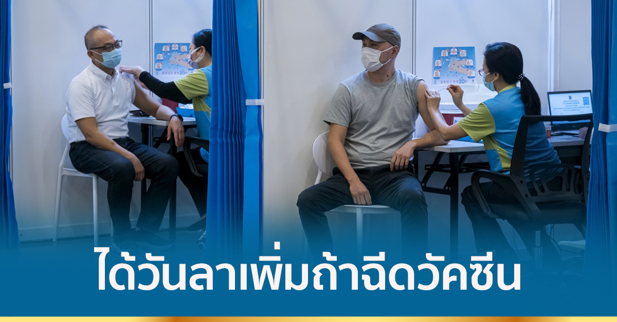 ฮ่องกง 31 พ.ค.- แหล่งข่าวเผยว่า ข้าราชการในฮ่องกงจะได้วันลาเพิ่ม หากฉีดวัคซีนป้องกันโรคติดเชื้อไวรัสโคโรนา 2019 หรือโควิด-19 เป็นมาตรการล่าสุดในการจูงใจให้คนฉีดวัคซีน