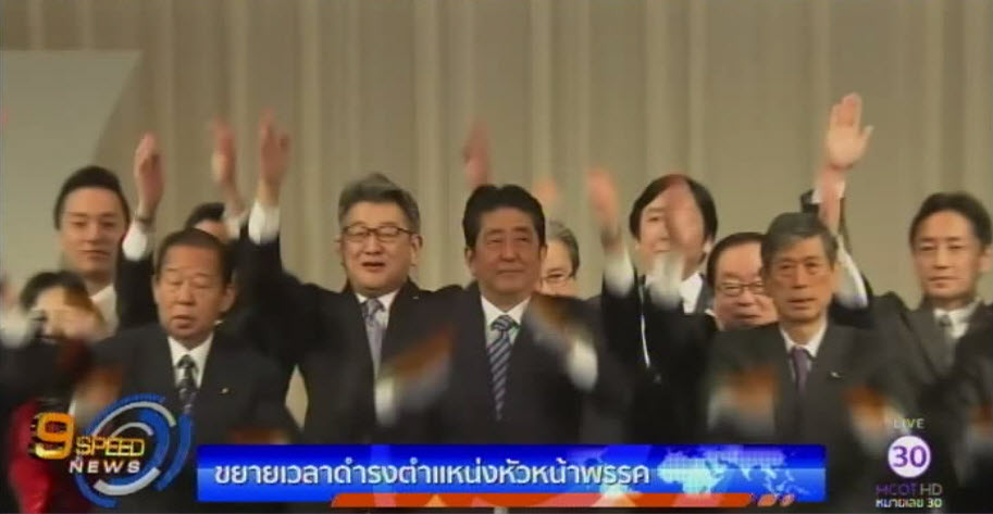 ญี่ปุ่น 5 มี.ค. – สมาชิกพรรคเสรีประชาธิปไตย หรือแอลดีพี ของนายกรัฐมนตรีชินโสะ อาเบะ และผู้สนับสนุนนายอาเบะ ประชุมหารือและลงมติในวันนี้ให้ขยายระยะการดำรงตำแหน่งหัวหน้าพรรคต่อเนื่องจากเดิม 2 สมัยออกเป็น 3 สมัย เพื่อให้สอดคล้องกับแผนการที่จะให้นายอาเบะ ยังคงเป็นหัวหน้าพรรคในช่วงเวลาที่ญี่ปุ่นเป็นเจ้าภาพการแข่งขันโอลิมปิก 2020 ที่กรุงโตเกียว และเพื่อเพิ่มโอกาสให้นายอาเบะประสบความสำเร็จในทางการเมือง คือ การแก้ไขรัฐธรรมนูญ วาระการดำรงตำแหน่ง หัวหน้าพรรคสมัยที่ 2 ของนายอาเบะจะหมดลงในราวฤดูร้อนปีหน้าซึ่งนายอาะเบะ ยังไม่ได้ประกาศการตัดสินใจว่าจะลงชิงตำแหน่งหัวหน้าพรรคอีกหรือไม่. -สำนักข่าวไทย