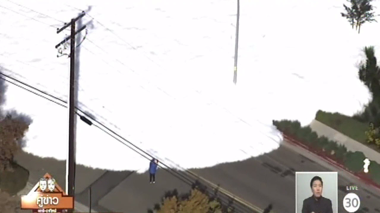 สหรัฐ 19 พ.ย.-เกิดทะเลโฟมสีขาวจำนวนมหาศาล ไหลออกจากโรงเก็บเครื่องบินสนามบินแห่งหนึ่ง ในรัฐแคลิฟอร์เนีย ออกมาท่วมรถยนต์ตามท้องถนน